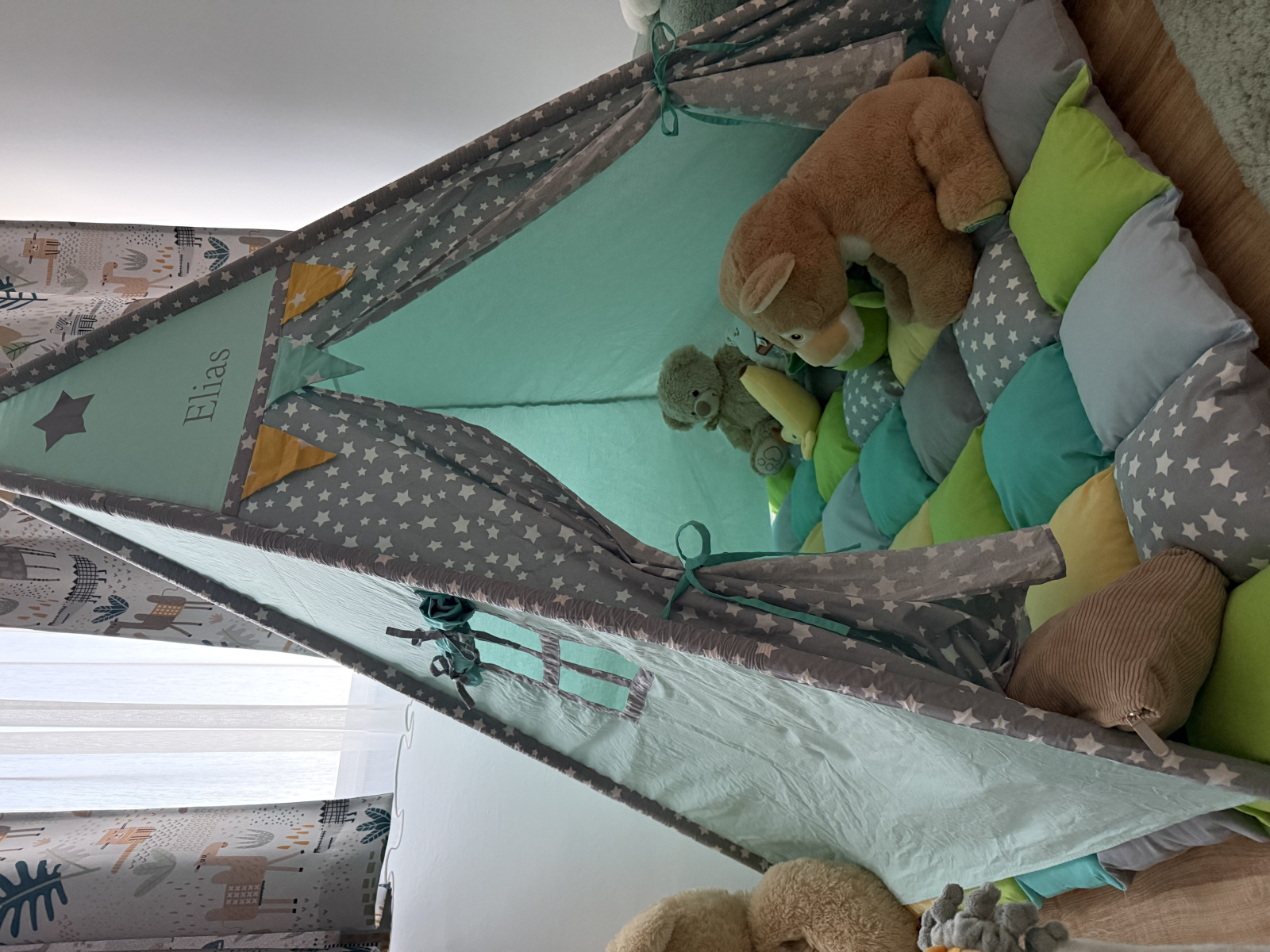 • REZISTENTA - Confectionat din bumbac organic, ranforce, certificat 100% conform standardelor europene de siguranta si cadrul din lemn de fag  netratat, il transforma in locul prietenos pentru micutii  nostri care adora sa-si creeze propriul univers.